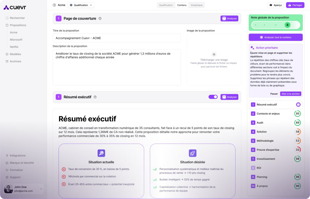En amont, Cuevr aide à clarifier la qualification du prospect. Cette étape permet de mieux évaluer la pertinence de l’investissement commercial. Pendant la rédaction, l’intelligence artificielle intégrée analyse la structure et la cohérence du contenu. Elle met en lumière les points à renforcer, sans se substituer au commercial. L’humain reste au cœur de la démarche.